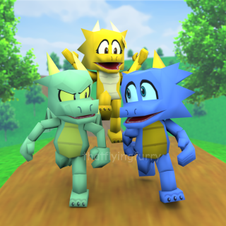 A trio of my old dragon characters. Dragonick (blue), Darius (green), and Daffodil.
